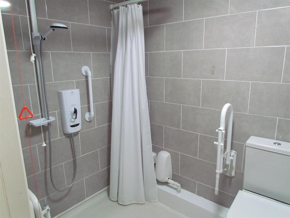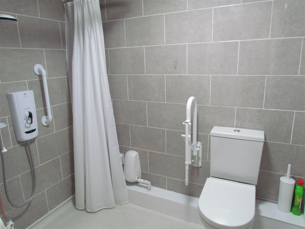 Comprising shower unit with seat, pedestal wash hand basin, low flush w.c., wall tiling, non slip floor, chrome heated towel rail and extractor fan.