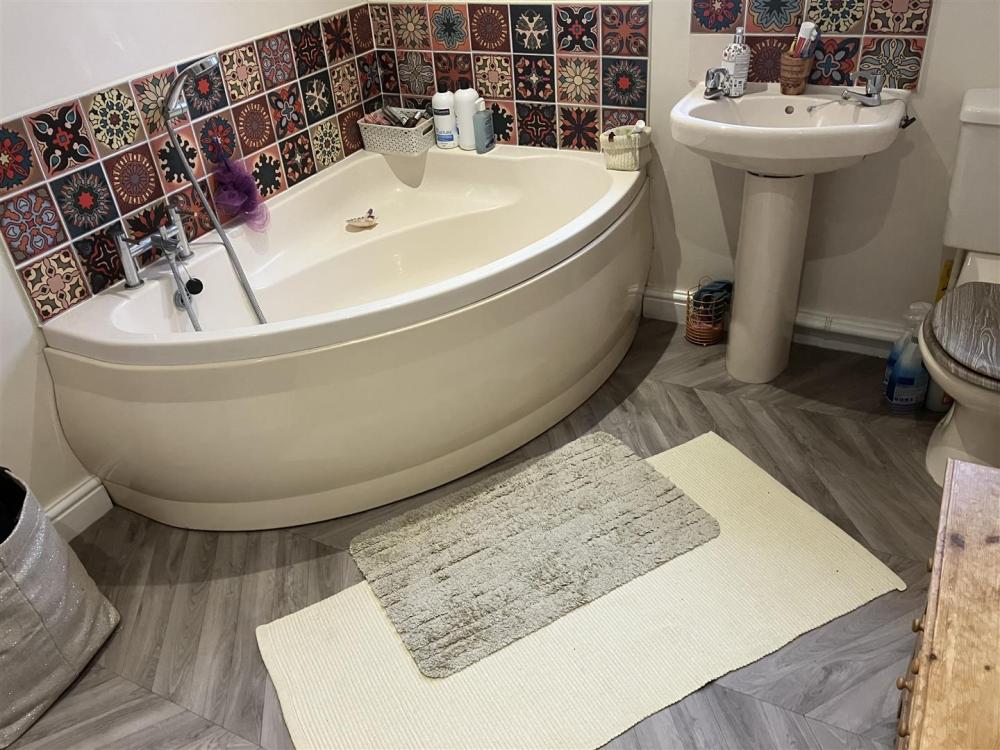 A three-piece suite comprising corner bath, low flush ec and pedestal wash hand basin. Storage cupboard. Twin aspect windows.