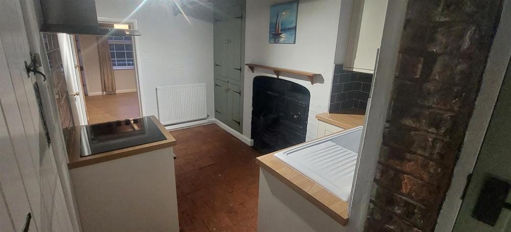 Rear aspect uPVC double glazed window, quarry tiled floor, beamed ceiling, feature cast iron range, recess under stairs cupboard. modern well appointed fitted kitchen, single drainer white ceramic sink unit, pantry cupboard with shelving and power. Single oven with grill and hob, and plumbing for a washing machine.