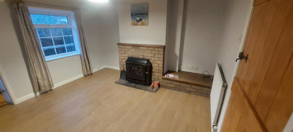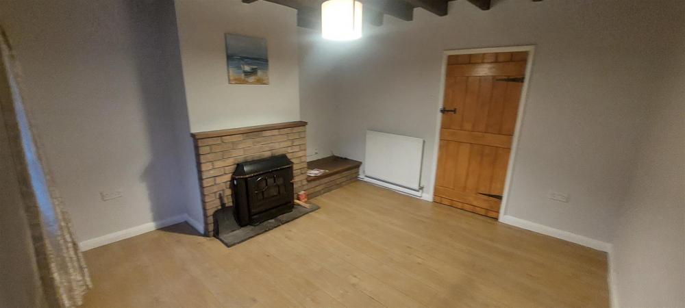 Front aspect uPVC double glazed window, laminated oak-effect wood floor, cast iron multi-fuel stove set into a stone recess with a timber mantel and back boiler providing central heating and hot water, beamed ceiling, radiator and telephone point.