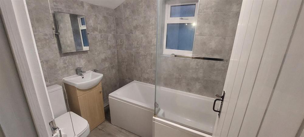 Rear aspect window, three piece suite comprising 'P' shaped bath with electric shower over and shower screen, pedestal wash hand basin and low flush wc, tiled walls, and chrome heated towel rail.