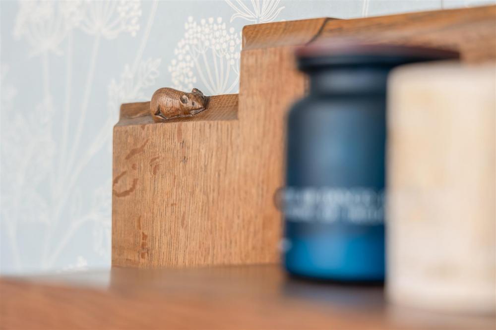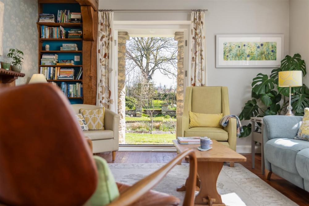 Triple aspect room enjoying delightful views over the garden, Inglenook style fireplace with oak beam over and Robert Thompson Mouseman Oak fireplace housing log burner set on hearth; oak book shelving to either side of the fireplace. Television aerial point, radiator and french doors leading to the covered Loggia and garden.