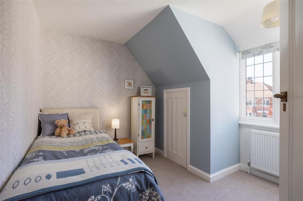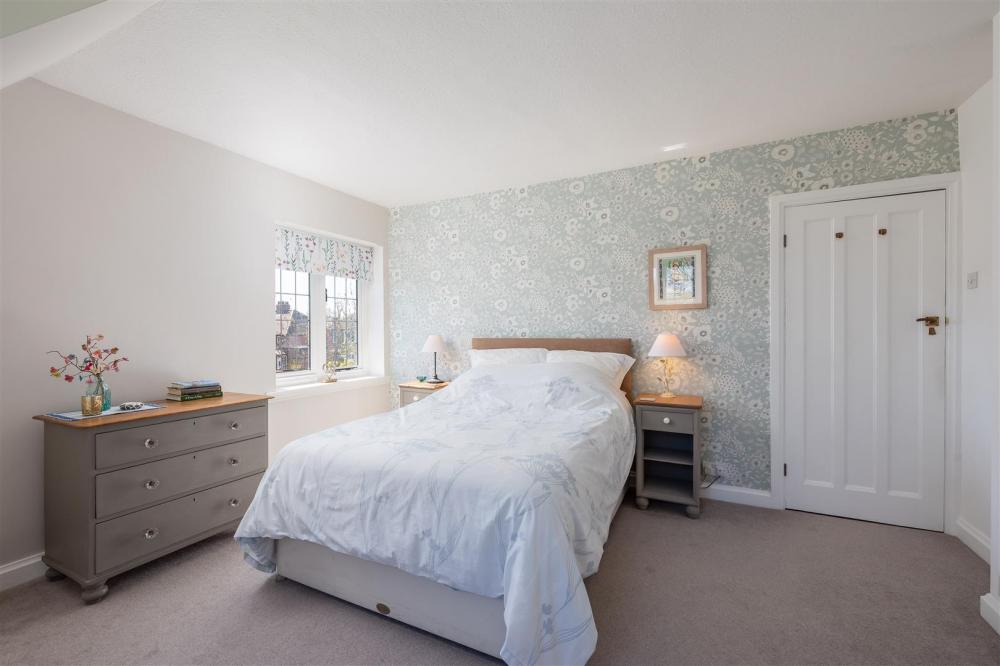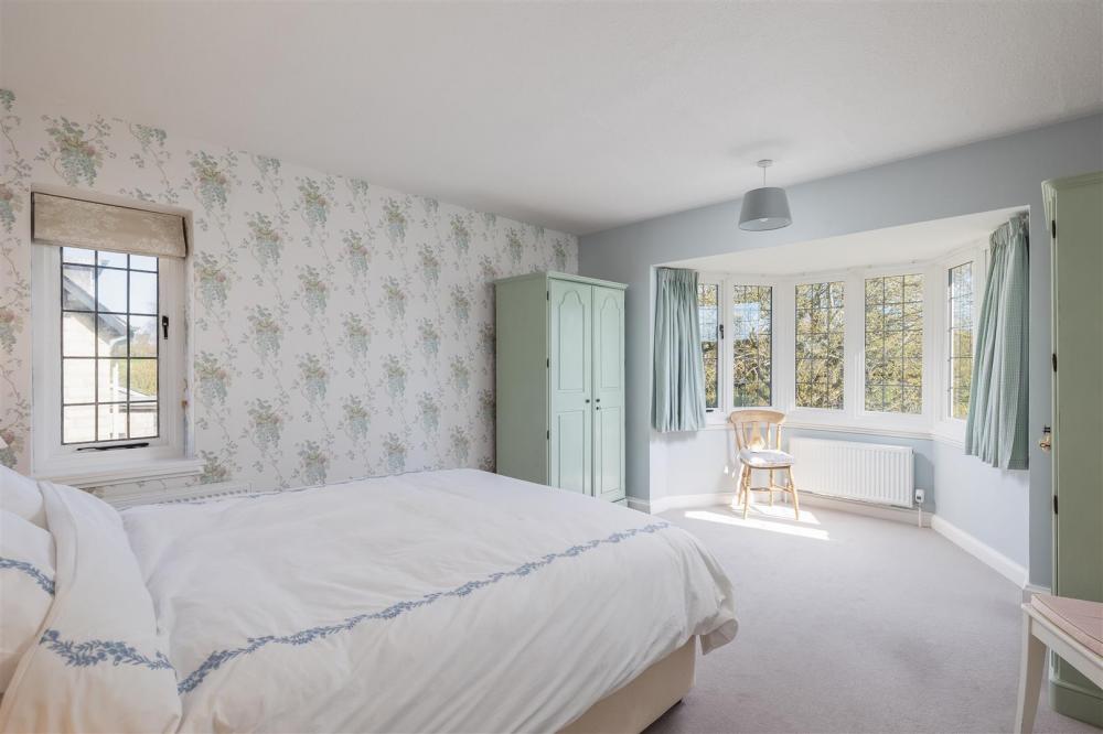 With lovely walk in bay window enjoying views over the garden; further side window, two radiators and two built in cupboards.