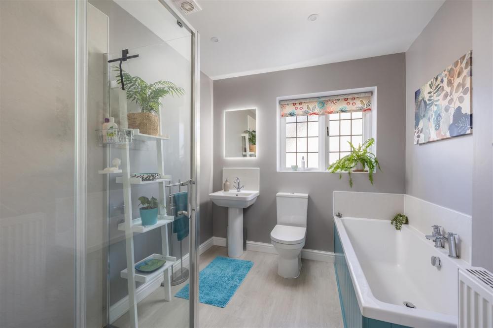 Recently re-fitted with suite comprising panelled bath with mixer taps, walk-in shower, wash hand basin and w.c. Built in wall cupboards, radiator, splash-backs, spot lights to ceiling, heated illuminated mirror and extractor fan.