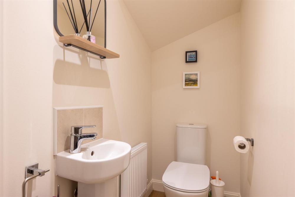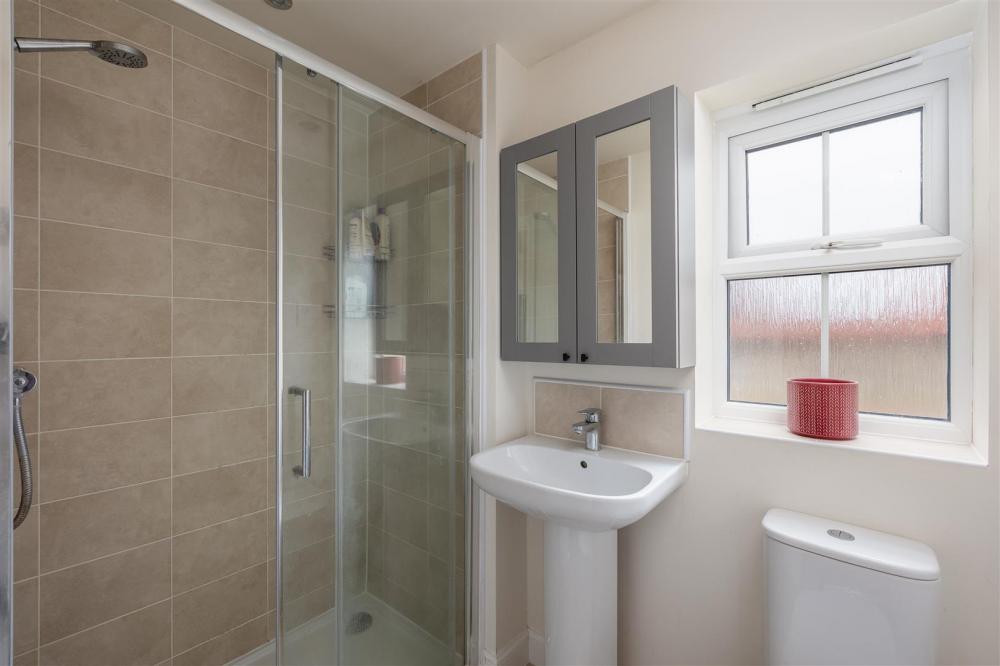 Comprising double shower cubicle being tiled with shower unit, pedestal wash hand basin, low flush w.c., partial wall tiling, tiled window sill, double glazed window to the side elevation, extractor fan, heated towel rail and spot lighting.
