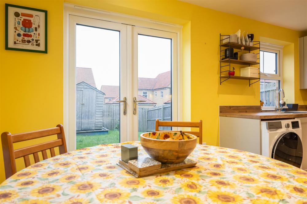 Housing a range of units comprising single drainer sink unit set within rolled edge work surfaces with complimentary tiled splash backs, wall and base units incorporating drawer compartments, built in oven, four ring gas hob with extractor canopy over, built in fridge freezer. Concealed wall mounted gas boiler, plumbing for automatic washing machine, cental heating radiator, double glazed french doors opening onto the rear garden and double galzed window to the rear elevation.