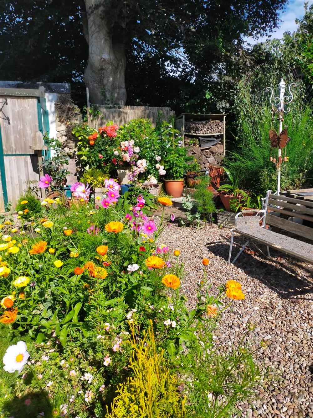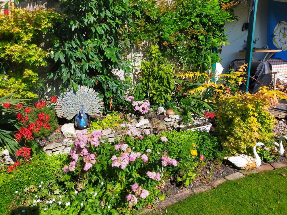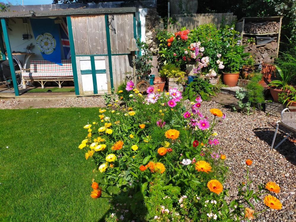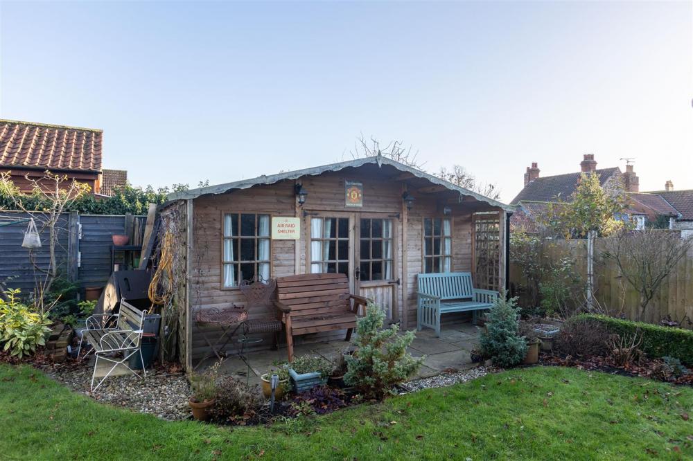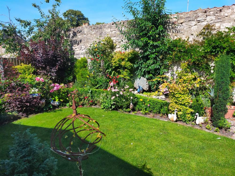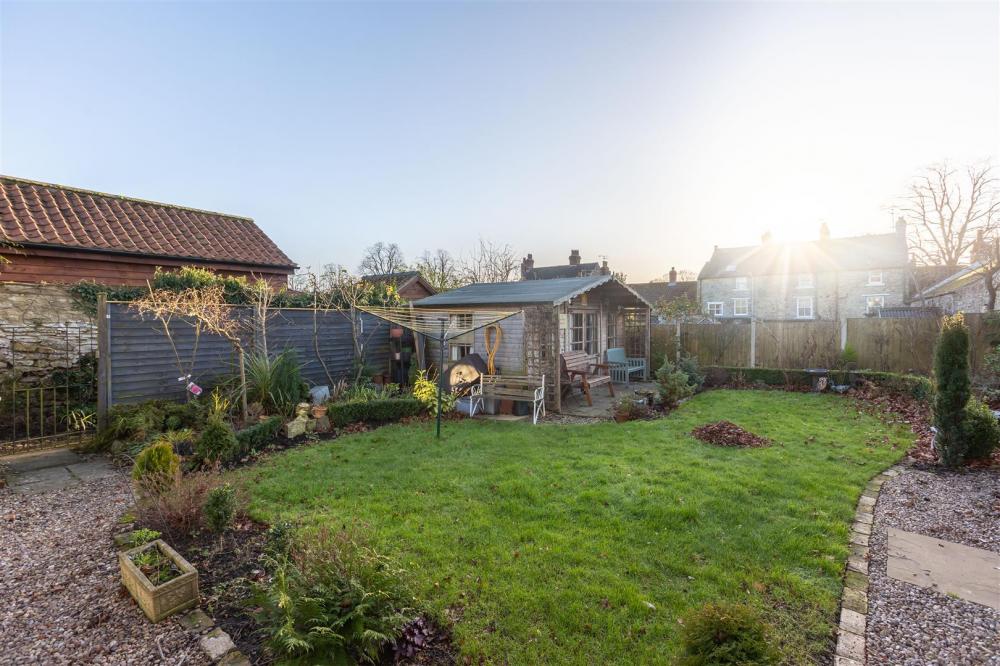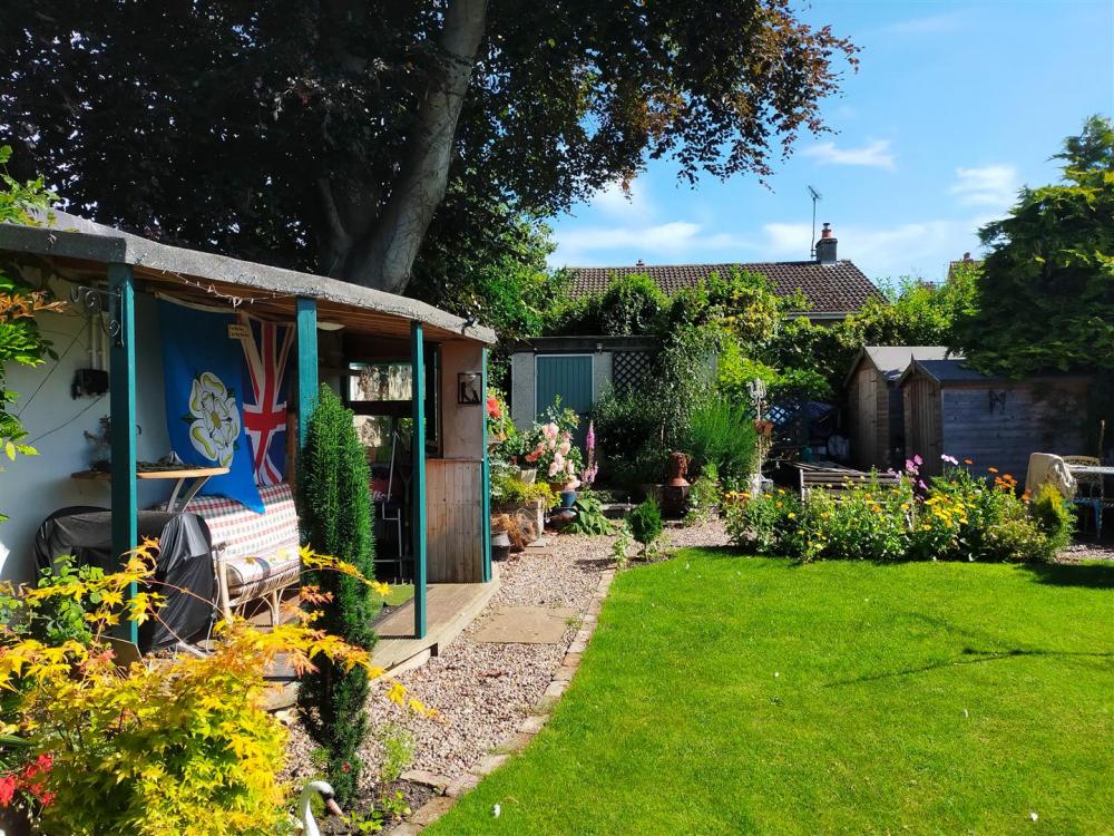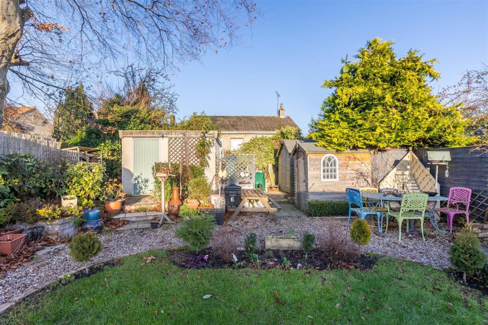 Enclosed paved courtyard with stone wall to the boundaries, garden gate and outside tap. Good sized garden with laid lawn, seating area with flower and shrubbery boarders and various outbuildings and summerhouse