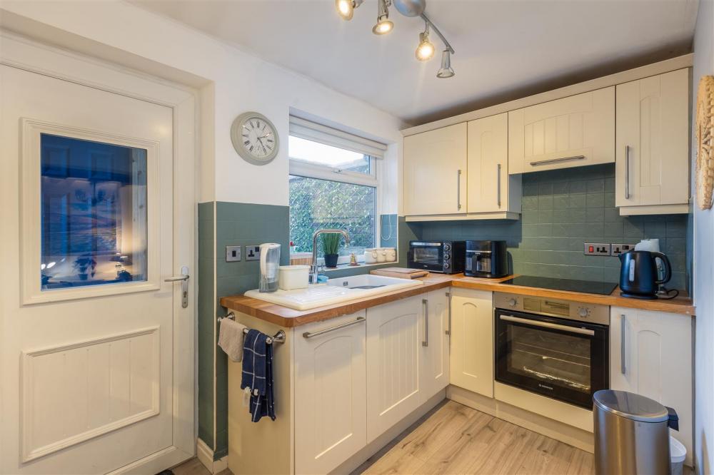 Comprise ceramic single drainer sink unit with mixer tap over, wall and base units incorporating drawer compartments with tiled splash backs, wood block work surfaces. Built in oven with four ring hob and extractor canopy over, built in fridge freezer, built in slim line dishwasher. Double glazed upvc window to the rear elevation and door to rear lobby.