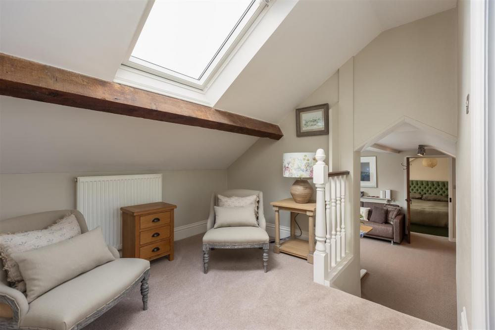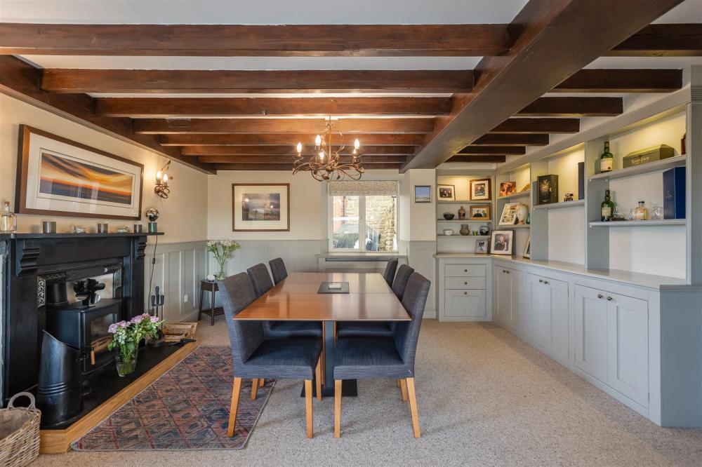 Front and side aspect uPVC double glazed windows, cast iron multi-fuel stove with surround, built-in shelving and cupboards, exposed beam ceiling.
