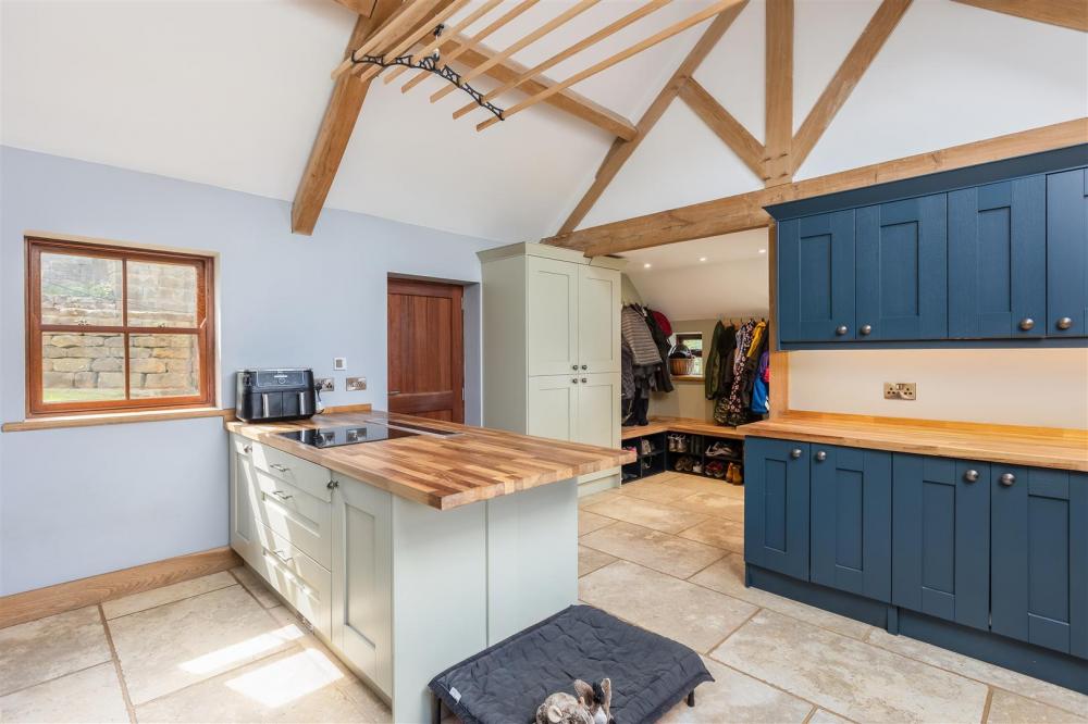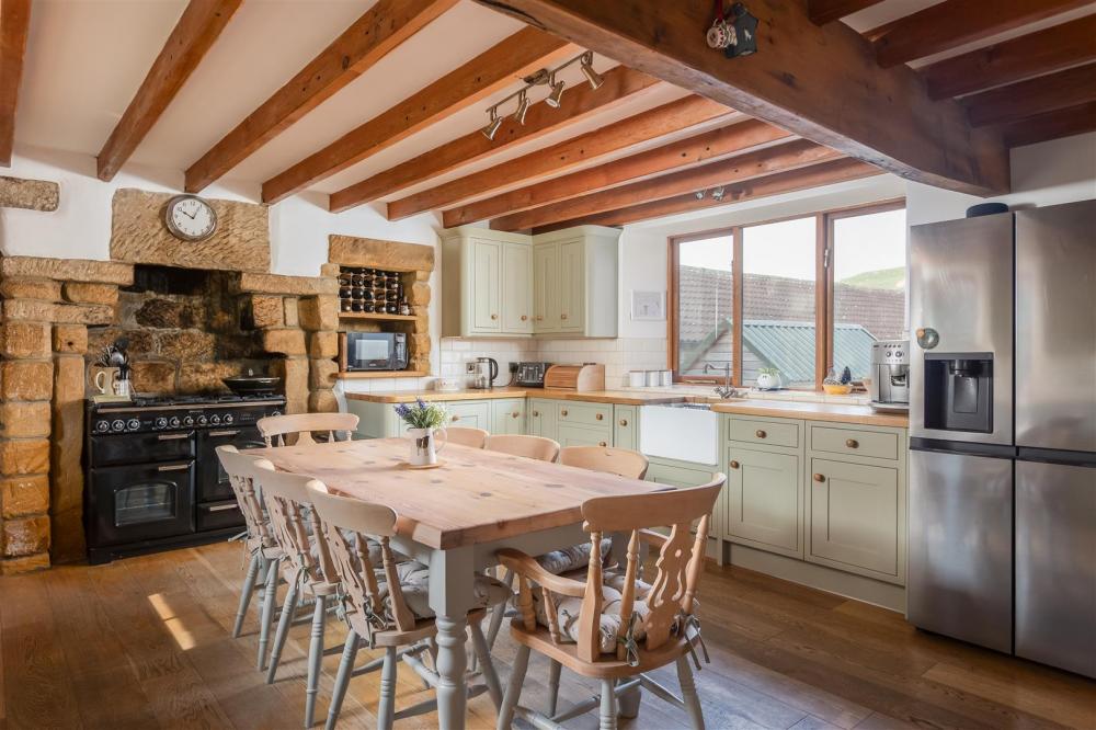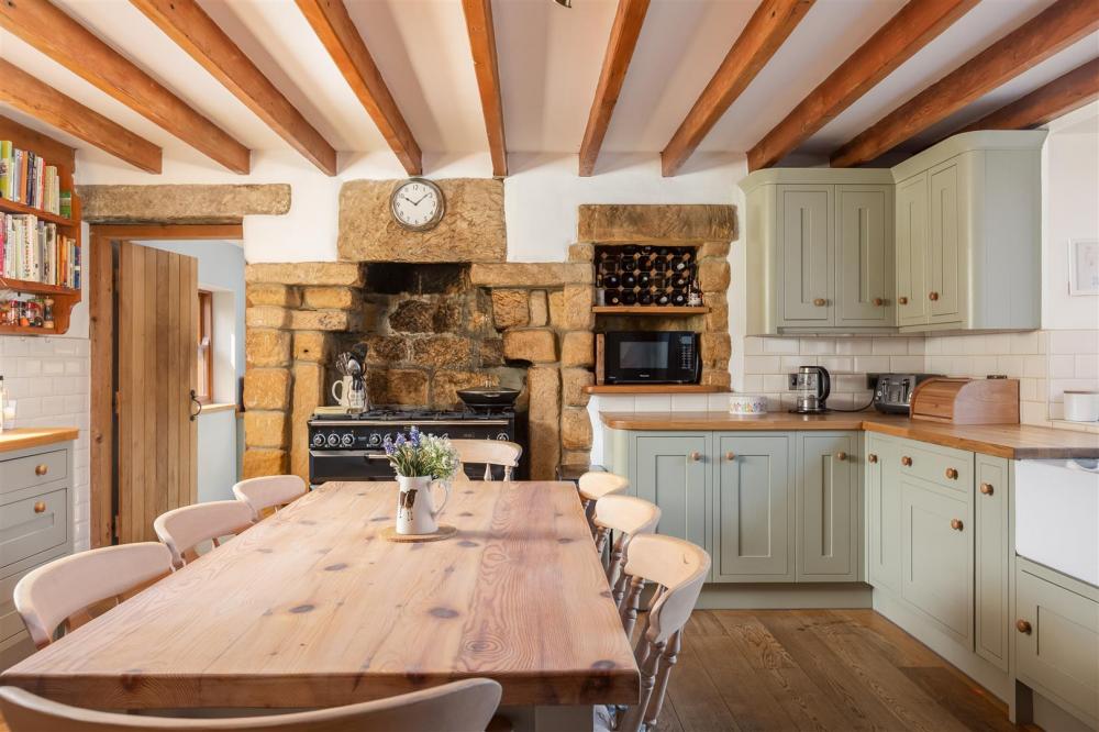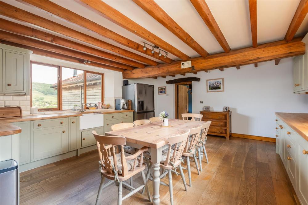 Dual aspect timber frame double glazed windows, range of bespoke fitted base and wall mounted units, Belfast sink with chrome mixer tap over, Rangemaster cooker into stone recess, integral dishwasher, exposed timber beams.