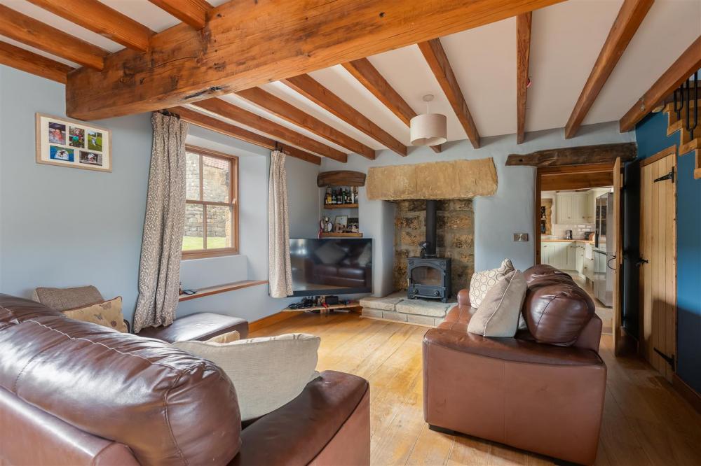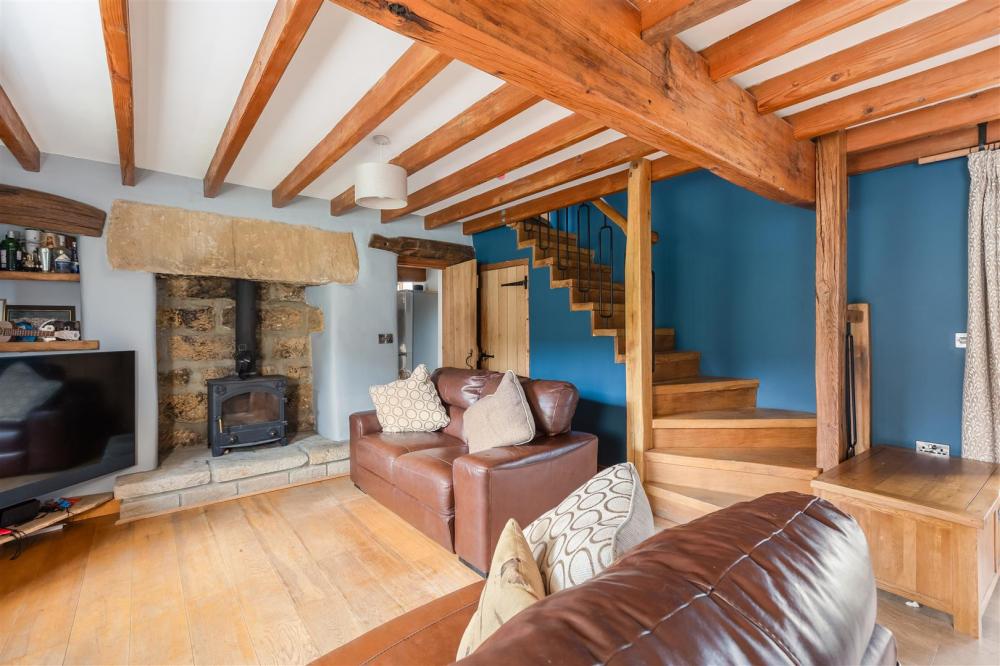 Dual aspect with 2 no. timber frame double glazed windows to the front and timber double doors to the rear outside, cast iron wood burning stove into stone recess on stone hearth, exposed timber beams, staircase to first floor.