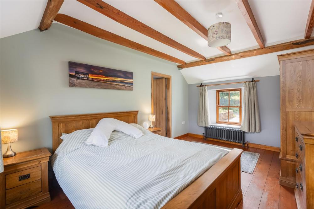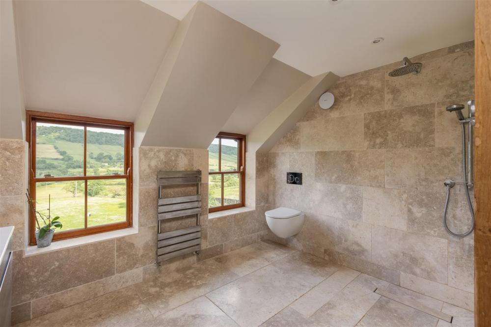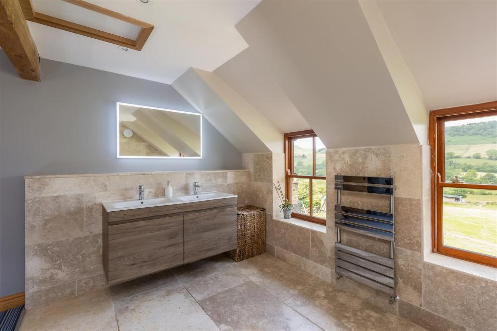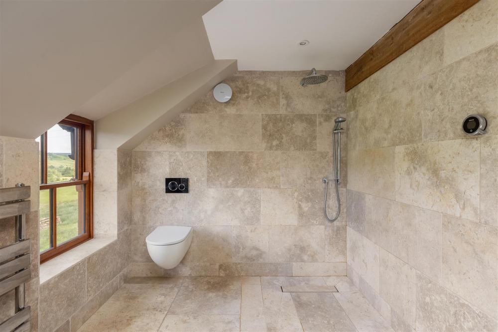 Rear aspect timber frame double glazed window, four piece suite comprising bath, shower cubicle with chrome fittings and glazed door, low flush wc, and wash hand basin, traditional column heated towel rail, fitted cupboard with shelving above, exposed timber beams, tiled floor and walls.