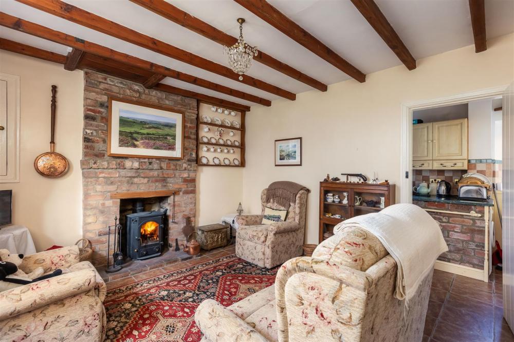 With part wood panelling to walls, stairs to first floor landing, inset beam with hanging hooks, wall mounted electric heater, tiled flooring, latch door leading to attractive sitting room. Stairs to first floor landing,