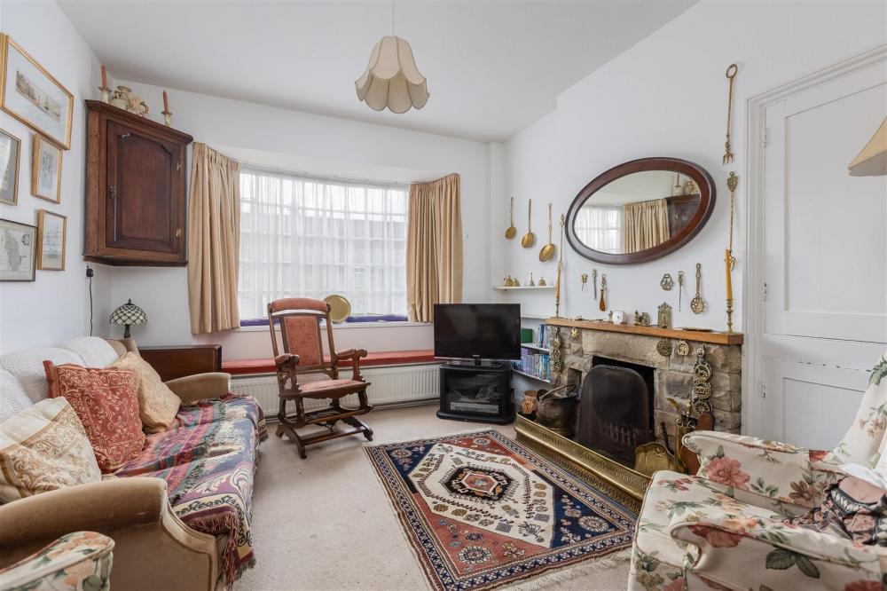 With bow window having window seat, stone built fireplace with open flue; built in cupboards to one side of fireplace, wall shelving, radiator and sliding doors to: