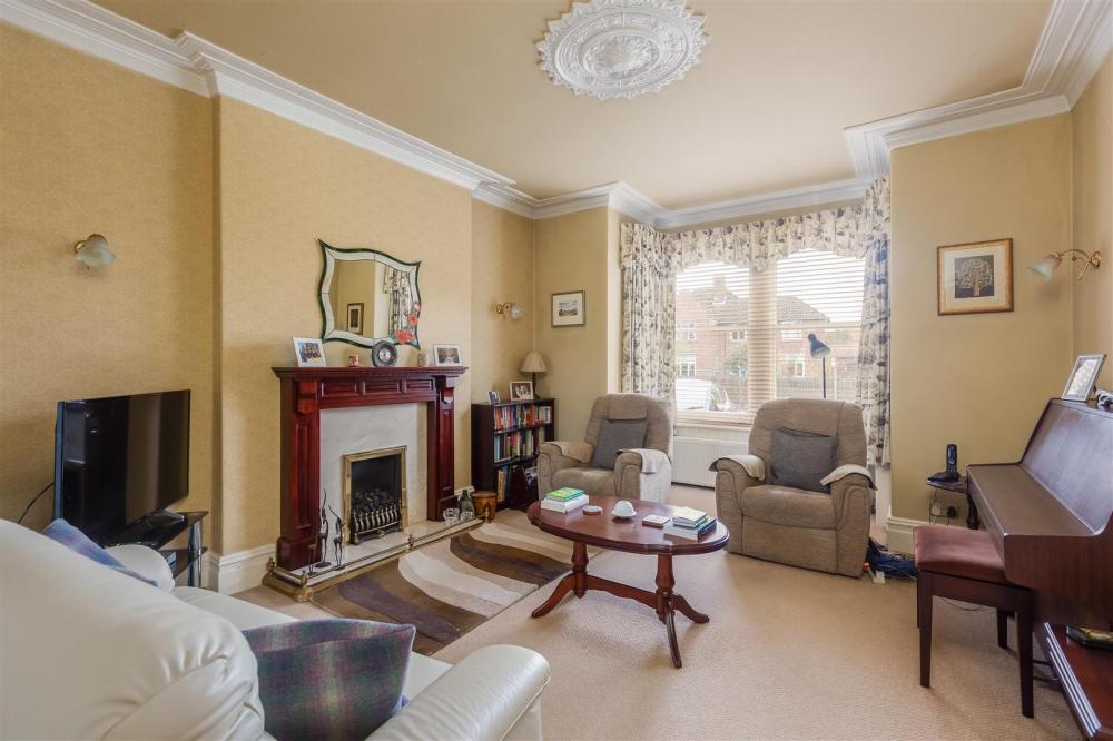 Sitting area with feature fireplace having wooden surround, marble back and hearth, gas fire, coving to ceiling, ceiling rose, central heating radiator, sash bay window to the front elevation.
