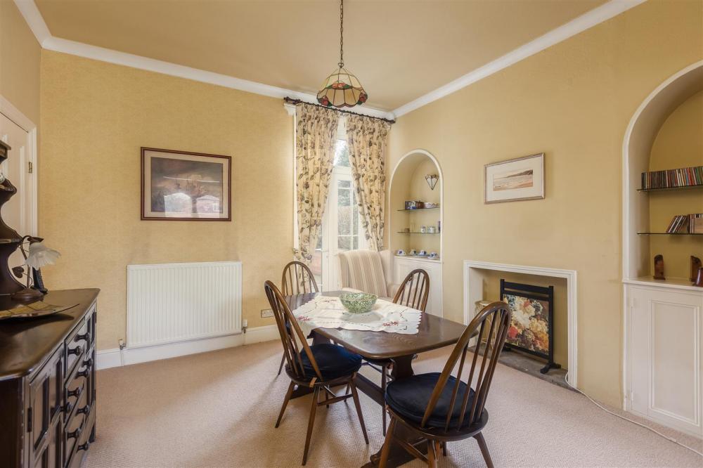 Dining area with fireplace with cupboard, archway and shelving to either side of the chimney breast. Central heating radiator, coving to ceiliing, double glazed double doors lead to the rear garden.