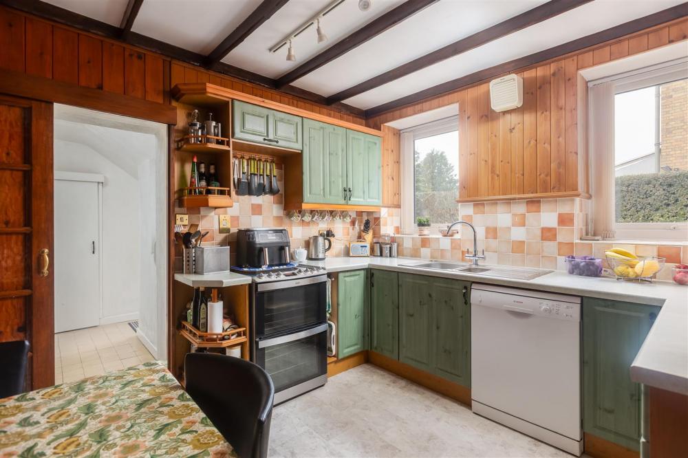 Comprising 1 1/2 bowl drainer sink unit set within rolled edge work surfaces with mixer tap over, wall and base units incorporating drawer compartments with tiled splash backs, wine rack, display shelving, plumbing for dishwasher, two double glazed windows to the side elevation with tiled window sills. Exposed beams to ceiling, part wood panelling to walls, central heating radiator and electric cooker point.