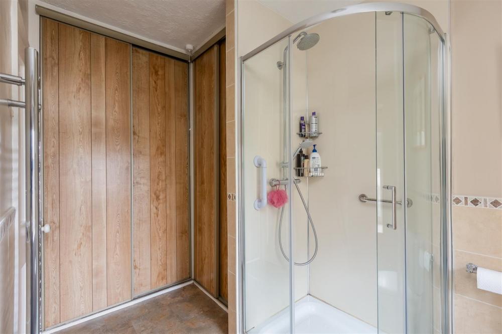 With panelled bath, separate shower cubicle with shower unit, pedestal wash hand basin, low flush w.c., partial wall tiling, tiled window sill, double glazed window to the side elevation , chrome heated towel rail and built in airing cupoard housing hot water cylinder and additional built in cupboards.