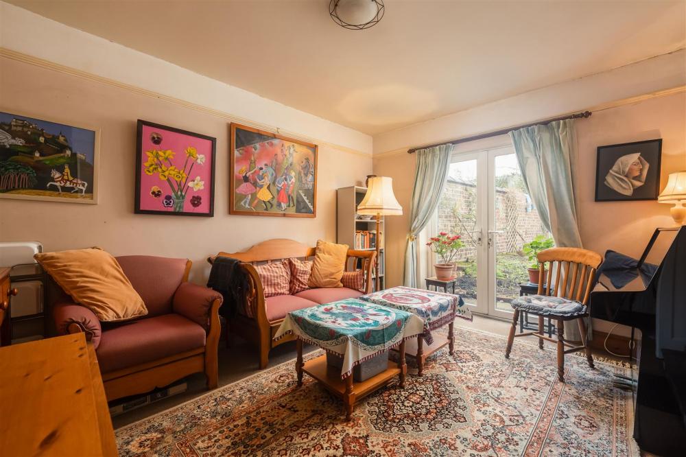 Rear aspect uPVC double glazed French doors; feature brick fireplace with cast iron multi-fuel stove; picture rail; single radiator.