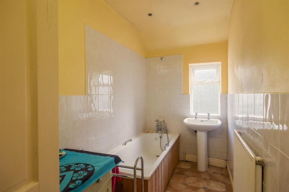 Rear aspect timber frame opaque single glazed window; two piece suite comprising panelled bath with traditional telephone-style shower mixer faucet; pedestal wash hand basin; part tiled walls, single radiator.