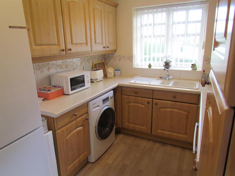 Comprising 1 1/2 bowl drainer sink unit set within rolled edge work surfaces, further wall and base units incorporating drawer compartments with tiled splash backs, built in oven, four ring gas hob with extractor canopy over, double glazed window to the front elevation, central heating radiator and door to outside.