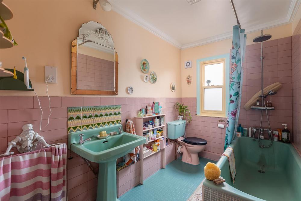 Comprising panelled bath with shower unit over, pedestal wash hand basin, low flush w.c., central heating radiator, partial wall tiling, window and coving to ceiling.