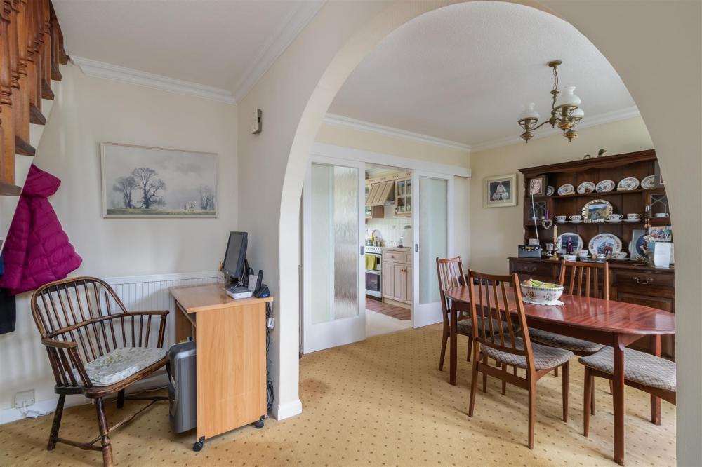 With coving to ceiling, central heating radiator, double glazed window to the front elevation, archway, double doors to dining kitchen. Stairs lead to galleried landing.