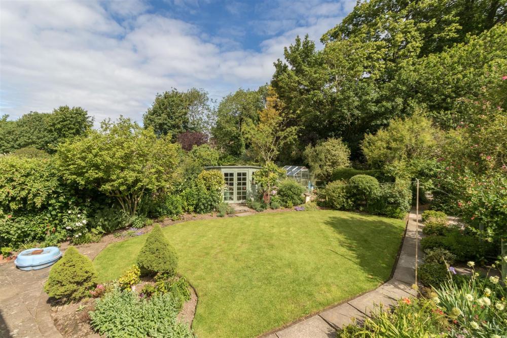 To the front the garden is laid to lawn with flower/shrubbery borders, driveway to the side leading to GARAGE 16'6" x 8'11" having light and power, up and over door and personal door to rear. Attractive rear garden with patio area, laid lawn, attractive flower/shrubbery borders and various other trees and shrubs, SUMMERHOUSE , established trees, secondary patio area and secret garden to the extreme rear with mature planting.