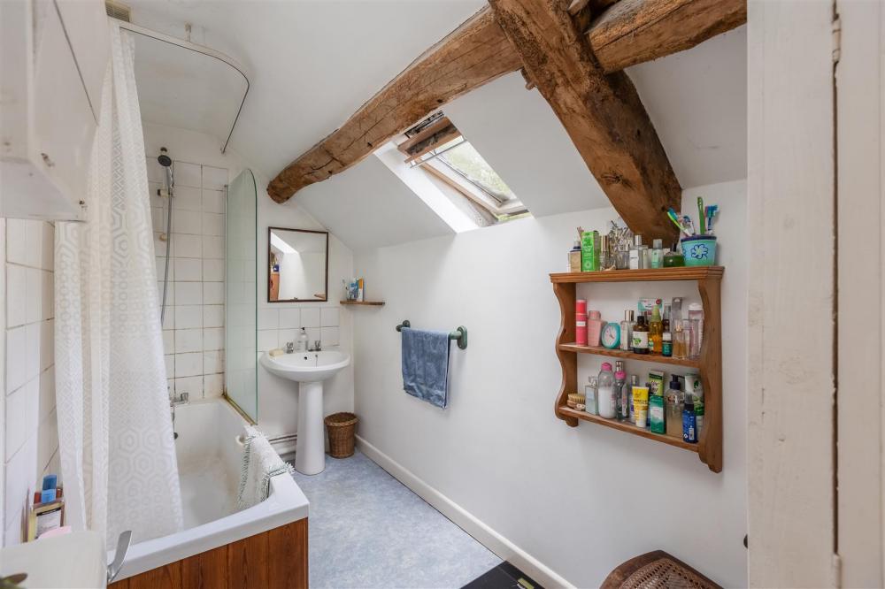 Front aspect timber frame single glazed window, three piece suite comprising panelled bath with shower over, wc, wash hand basin int vanity unit, heated towel rail.
