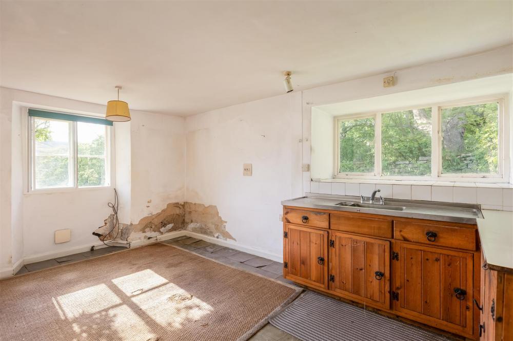 Front aspect timber frame single glazed window with secondary glazing, side aspect timber frame single glazed window, dated range of base and wall mounted units, 1.5 bowl stainless steel sink and double drainer unit, extractor fan, LPG fireplace.