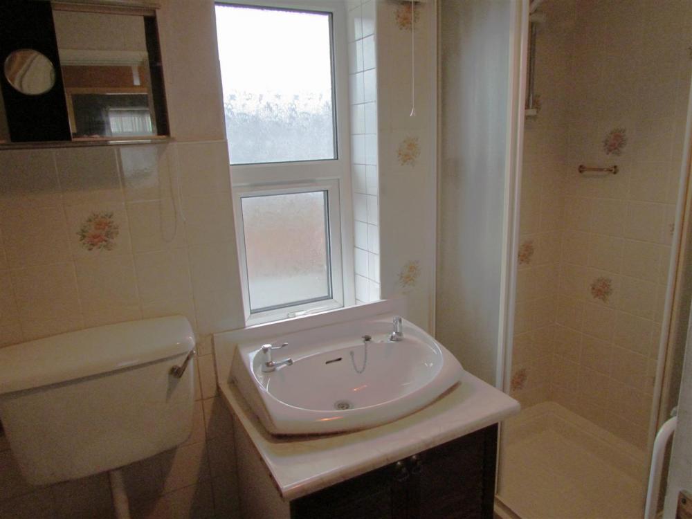 Comprising shower cubicle, vanity unit with inset wash hand basin, low flush w.c., and double glazed window.