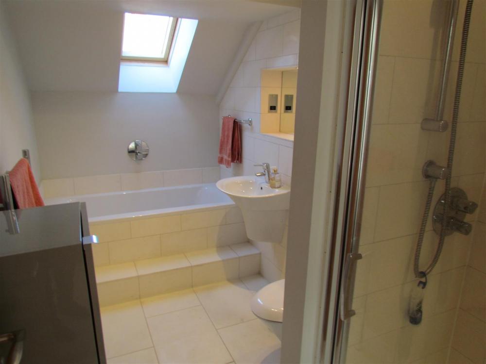 Shower cubicle and tiled shower unit, tiled panelled bath, wash hand basin, low flush w.c.; tiled splash-backs, tiled flooring. Feature alcove with downlighting. Chrome heated towel rail, Bathroom cupboard.