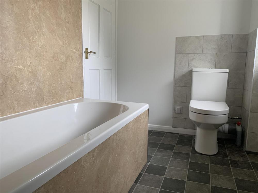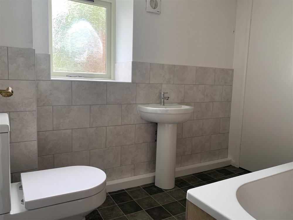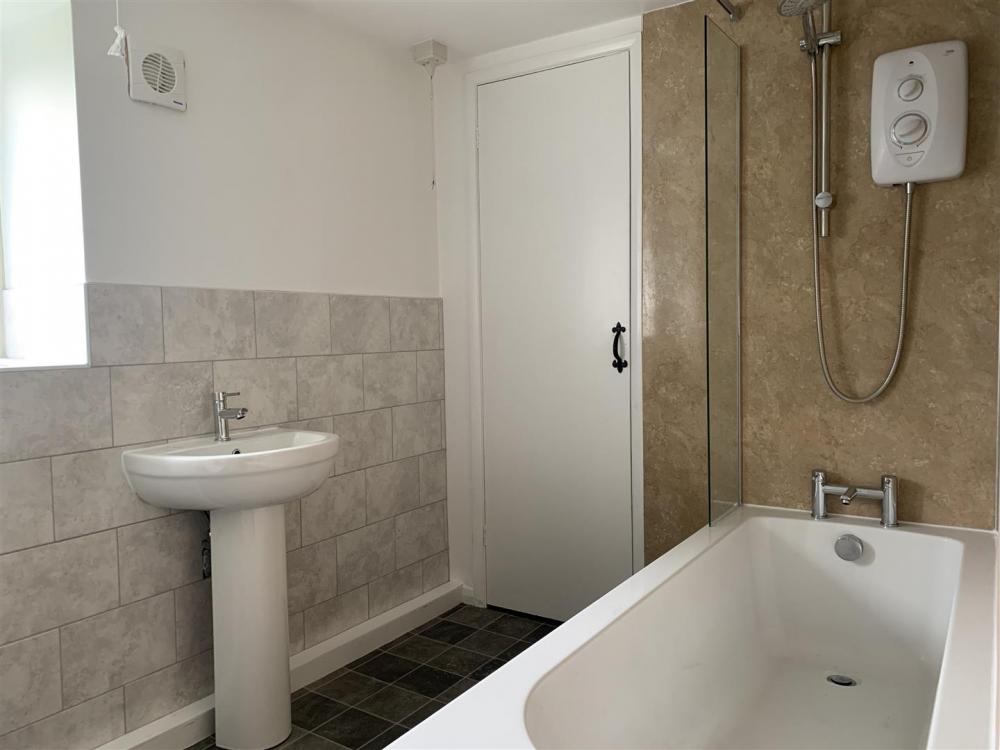 Matching white suite comprising bath with electric shower unit over, pedestal wash hand basin, low flush wc, airing cupboard housing the water cylinder and electric immersion heater, opaque timber framed double-glazed window to the rear.