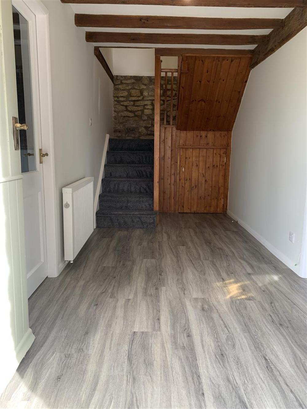 With staircase to the first floor, under stairs cupboard, part exposed stone walls, telephone point and electric radiator.