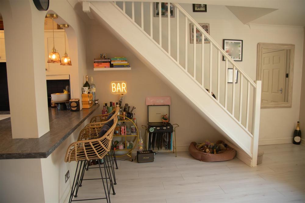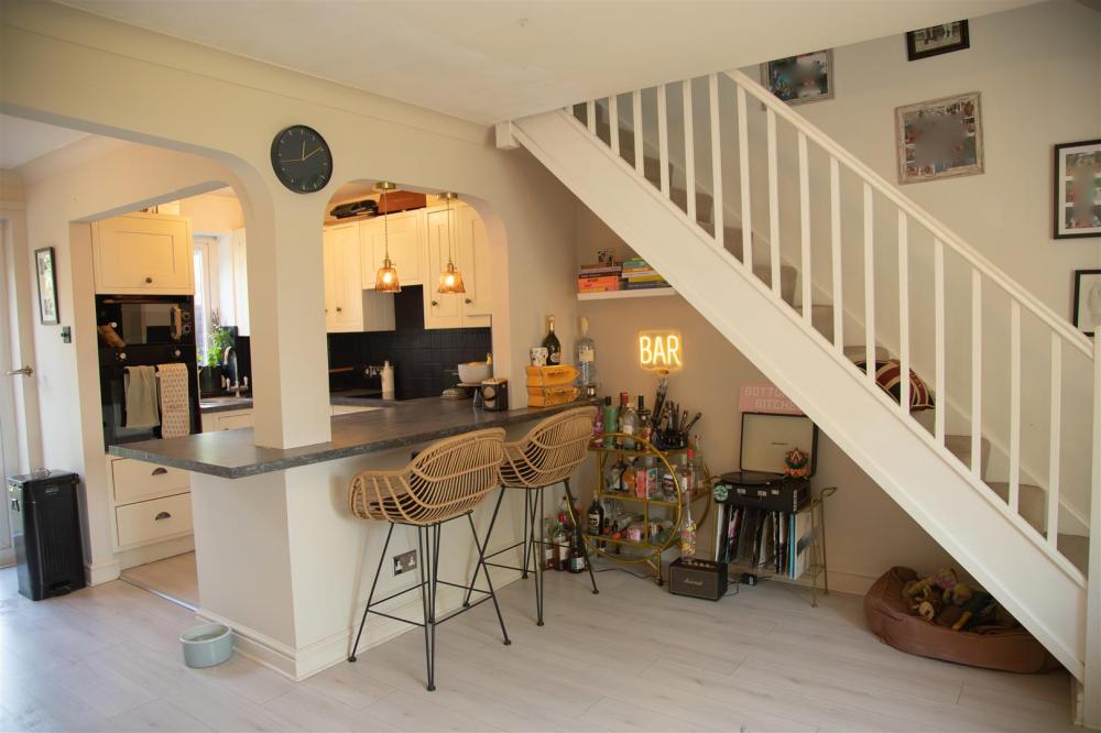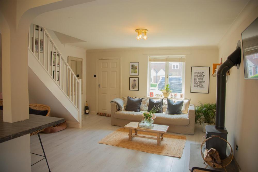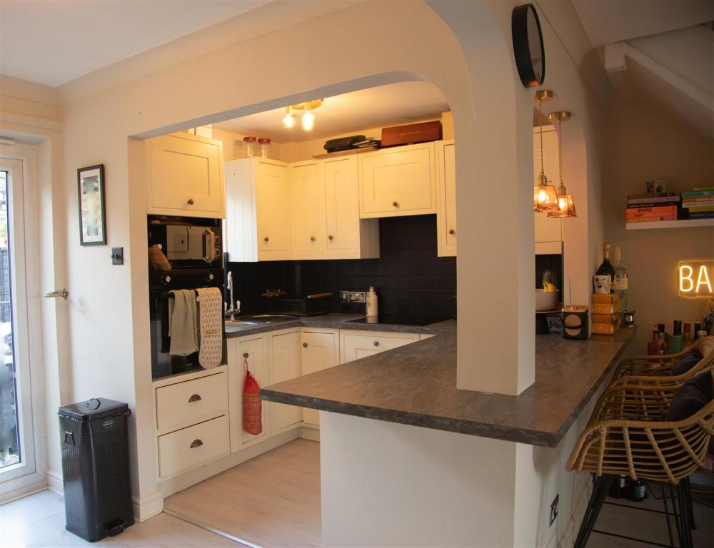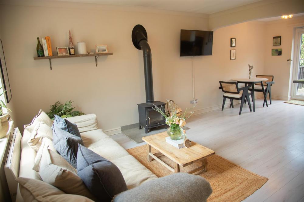 Dual aspect with uPVC double glazed window to the front and uPVC double glazed French doors and window to the rear, multi-fuel wood burning stove, wall mounted electric heater, staircase to first floor. The kitchen area comprises stainless steel single sink and drainer with chrome mixer tap over and set within rolled work surfaces, tiled splash backs, range of fitted base and wall mounted units, built-in oven and microwave oven, four ring hob with extractor hood over.