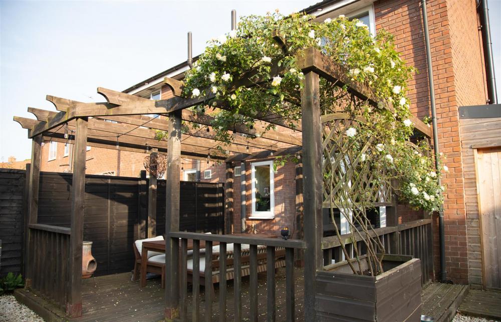 To the front, there are open lawned gardens with private driveway to the side. To the rear, there is an enclosed lawned garden with herbaceous borders and raised beds, together with decking area and pergola.
