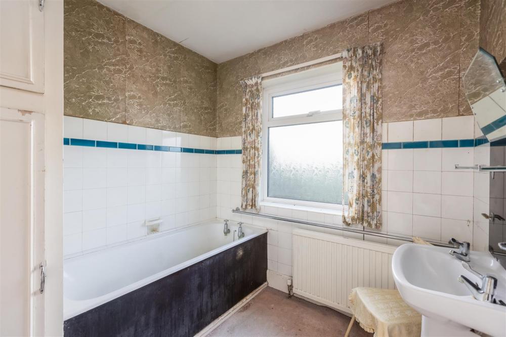 Opaque uPVC double glazed window to the rear, two piece suite comprising panelled bath and wash hand basin, airing cupboard, part tiled walls.