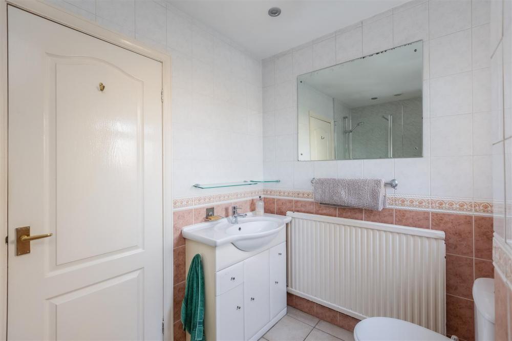 Rear aspect uPVC double glazed window, wall length shower cubicle with chrome fittings and glazed screen, low flush wc and wash hand basin into vanity unit, single radiator.