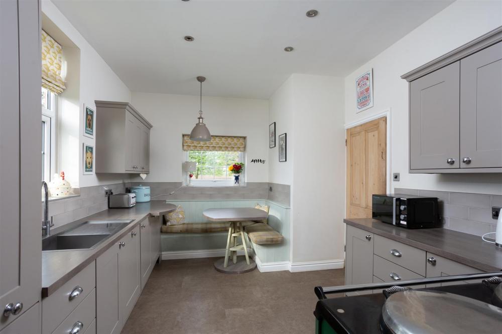 With tile floor, units at low and high level, with stainless steel sink, integrated dishwasher and an oil-fired AGA.