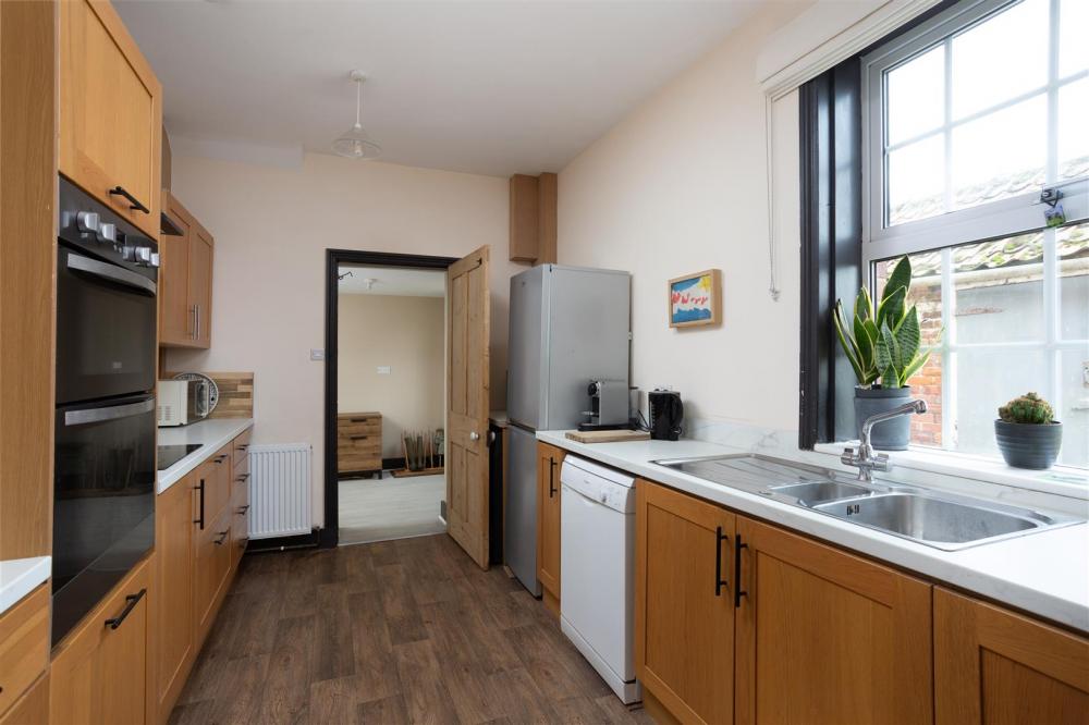 With wood effect vinyl flooring, units at low and high level, with stainless steel sink, plumbing for a dishwasher and integrated double cooker.