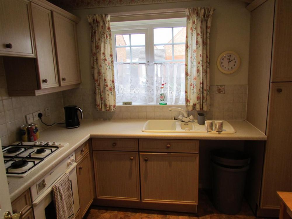 Comprising 1 1/2 bowl sink unit set within rolled edge work surfaces with tiled splash backs, further wall and base units incorporating drawer compartments, built in oven with four ring gas hob, plumbing for automatic washing machine, central heating radiator, double glazed window, door to outside.