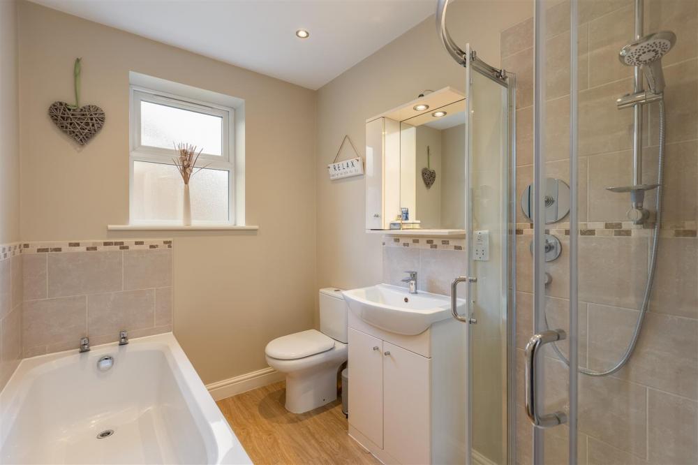 Side aspect opaque uPVC double glazed window, four piece suite comprising panelled bath, shower cubicle with chrome fittings, wash hand basin into vanity unit, low flush wc, radiator.